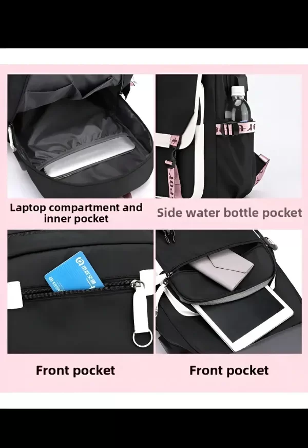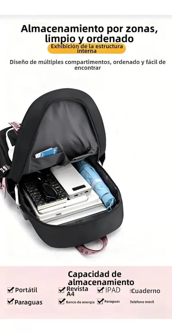 La mochila incluye cuatro bolsillos, lo que facilita la organización de tus objetos personales. También dispone de un puerto USB y una salida para auriculares, permitiendo una experiencia de uso más cómoda y conectada. Su protección lumbar añade un nivel extra de confort, ideal para largas jornadas de estudio o actividades diarias.